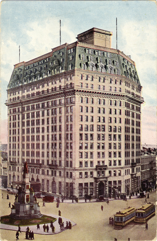 View of Hotel Pontchartrain from corner. Multistory building has mansard roof; Soldiers' and Sailors' Monument and streetcars in foreground. Printed on back: "Hotel Pontchartain, Detroit, Michigan. Fireproof, modern, rates reasonable, central location. Made by Chilton Company, Phila., Pa., U.S.A., 3556."