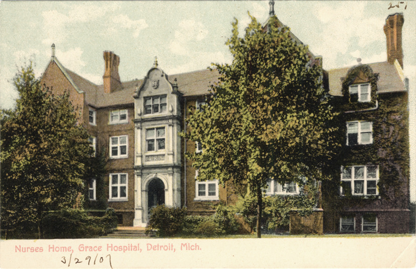 View of nurses' residence at Grace Hospital; three-story brick building with Chateauesque details is partially obscured by trees. Printed on front: "Nurses Home, Grace Hospital, Detroit, Mich." Handwritten on front: "3/29/07." Printed on back: "No. 648, Wolverine News Co., Detroit, Mich., printed in Germany."