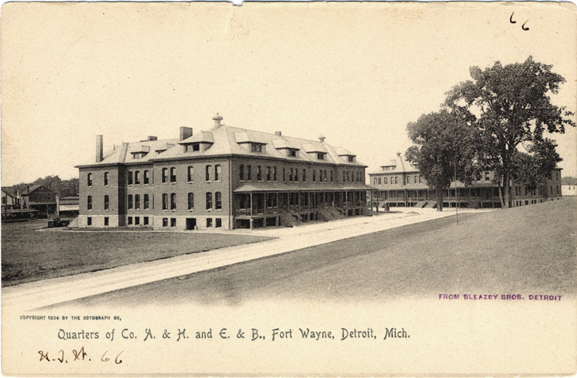 View of soldiers' quarters at Fort Wayne; two adjacent two-story brick buildings with roof dormers and covered verandas. Printed on front: "Quarters of Co. A. & H. and E. & B., Fort Wayne, Detroit, Mich. Copyright 1904 by the Rotograph Co." Stamped on front: "From Bleazby Bros., Detroit." Handwritten on front: "W.J.W. 66." Printed on back: "No. 3851 The Rotograph Co., N.Y. City, (Germany)."