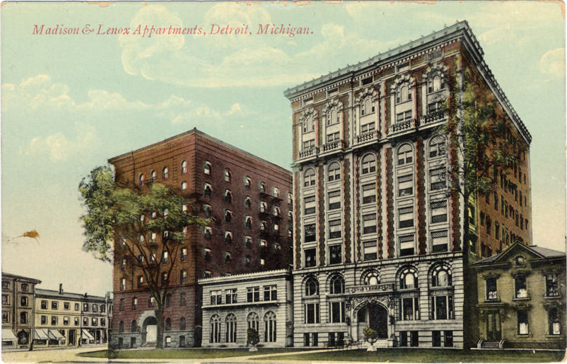View of Madison and Lenox apartment buildings in Detroit, Michigan. Multistory brick and stone buildings have arched entrances; commercial buildings in background. Printed on front: "Madison & Lenox appartments [sic], Detroit, Michigan." Printed on back: "551, Wolverine News Co., Detroit, Mich. Printed in Belgium."