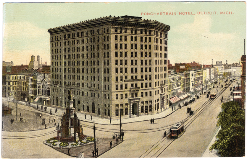 View of Hotel Pontchartrain on corner with Soldiers' and Sailors' Monument in foreground. Commercial buildings along street; streetcar travels in front of hotel. Printed on front: "Pontchartrain Hotel, Detroit, Mich." Printed on back: "Made expressly for S.H. Knox & Co. Printed in Germany."