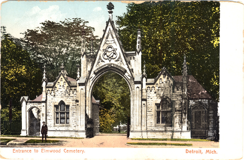View of stone Gothic revival gate leading to Elmwood Cemetery; man stands in front of arched entrance. Printed on front: "Entrance to Elmwood Cemetery, Detroit, Mich." Printed on back: "A7347, published by the Detroit News Company, Detroit, Mich., Leipzig, Dresden." American News Co. publisher trademark printed on back. Handwritten on back in upper right corner: "7/13/11."