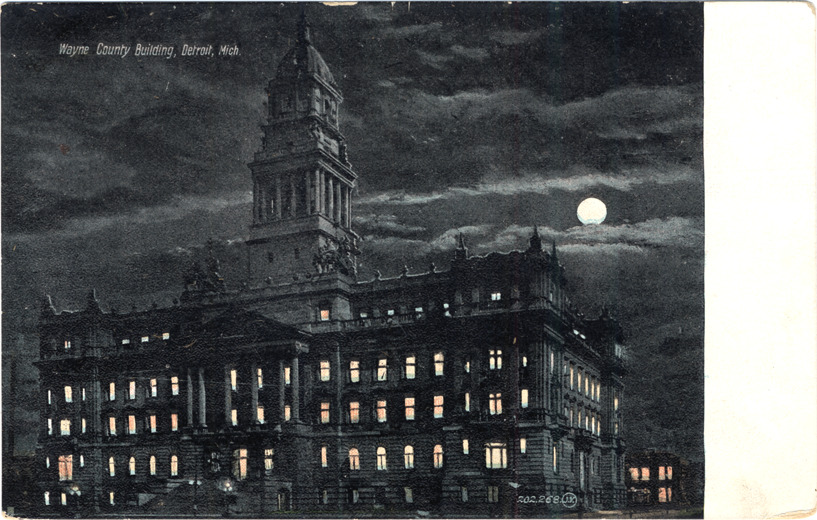 Nighttime view of Wayne County building; building windows are illuminated, moon overhead in sky. Printed on front: "Wayne County building, Detroit, Mich., 202,268." Printed on back: "Published by Wolverine News Co., Detroit, Mich. Printed in Great Britain." Handwritten on back: "Received your card but am still at my old trick at neglecting to write expect to go to Sarnia this summer. J.C." Card is postmarked March 16, 1909.