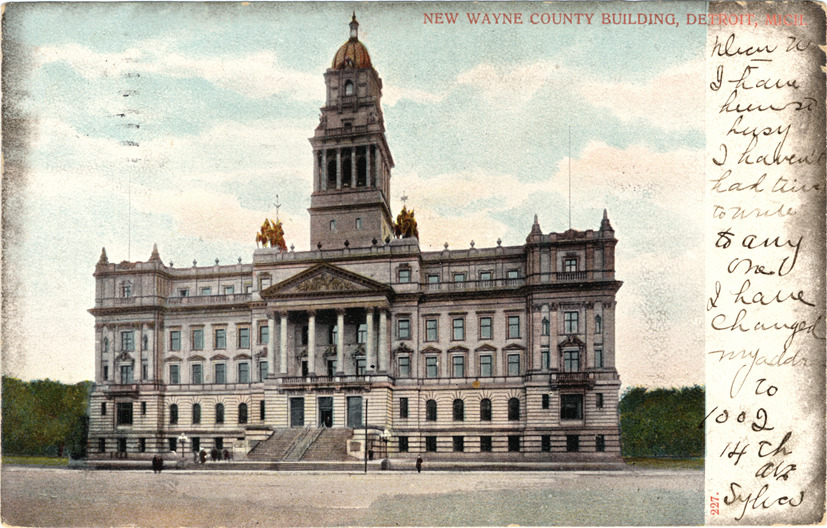 View of Wayne County building. Printed on front: "New Wayne County building, Detroit, Mich., 227." Handwritten on front: "Dear W., I have been so busy I haven't had time to write to any one, I have changed my address to 1002 14th Av. Sylvia." Printed on back: "A.C. Bosselman & Co., New York." Card is postmarked October 4, 1909.