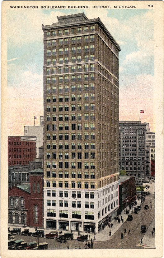 View of unidentified multistory office or commercial building on Washington Blvd. Automobiles parked on street; pedestrians walk on sidewalks. Printed on front: "Washington Boulevard building, Detroit, Michigan, 78." Printed on back: "Pub. by the United News Co., Detroit, Mich."
