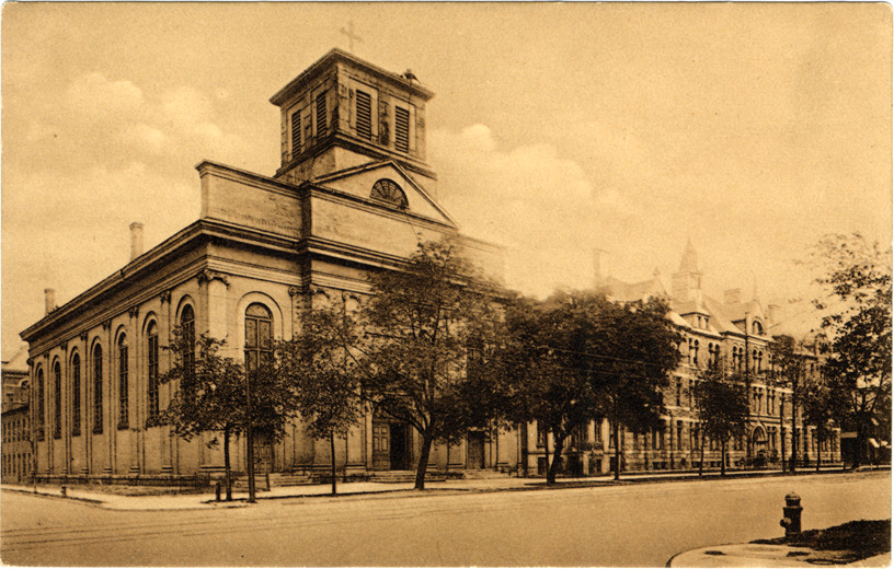 Front and side view of Sts. Peter and Paul Jesuit Church. Stone church building has Ionic pilasters on facade and square tower over entrance. Church is partially obscured by trees. View of Detroit College on right. Printed on back: "No. 524, Detroit, Mich., Jesuit Church and Detroit College. A.C. Dietsche, Detroit, Mich. and Leipzig. Made in Germany." Handwritten on back in upper right corner: "11/8/07."