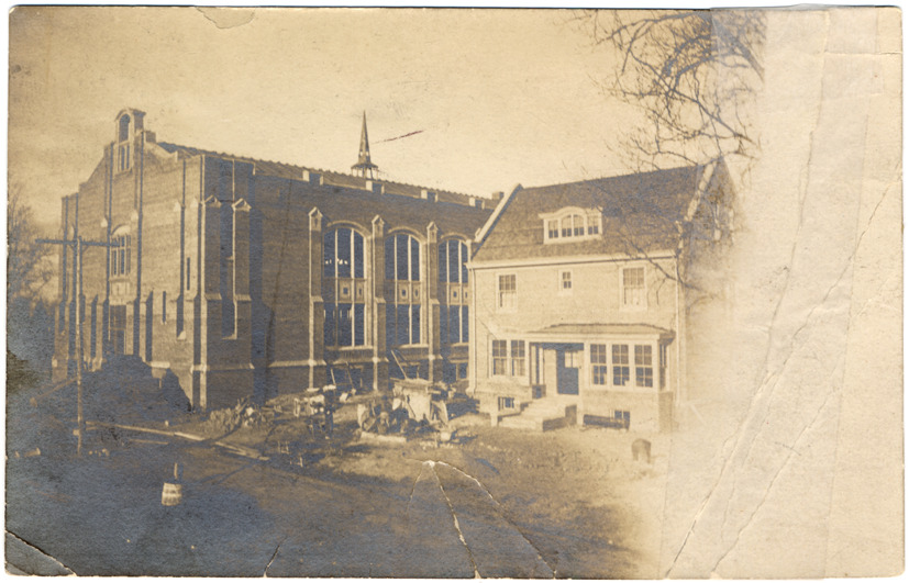 View of St. Florian Catholic Church under construction; building materials and debris on ground next to church. Side-gabled house is adjacent to church building. Handwritten on back: "Hamtramck, Dec. 30. Honorable Sir! Your presence at the dedication of St. Florians Church is earnestly requested on Sunday, Jan. 10th 1909 at ten a.m. Wishing you a happy New Year. I remain yours truly, Rev. B. Zmijewski." Card is postmarked December 31, 1908.