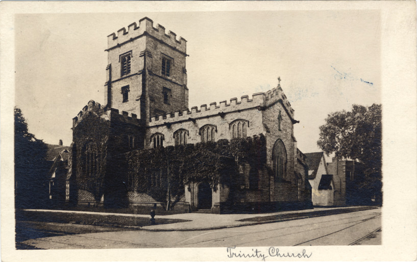 View of Trinity Protestant Episcopal Church; Perpendicular Gothic-style stone church building has castellated roof and square bell tower. Windows on side of church are partially covered with ivy. Handwritten on front: "Trinity Church." Handwritten on back in upper right corner: "10/13/19."