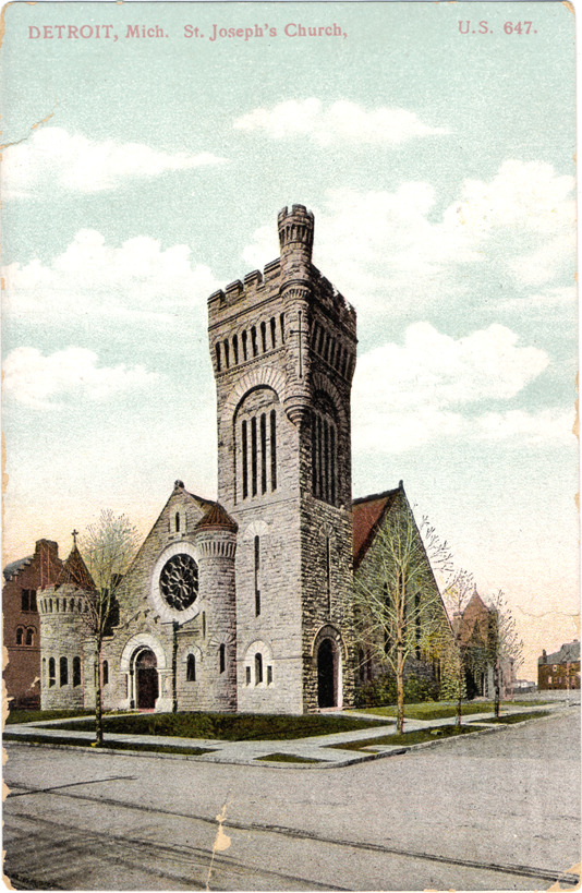 Front and side view of St. Joseph's Church; stone church building has square, castellated tower and rose window at entrance. Printed on front: "Detroit, Mich. St. Joseph's Church, U.S. 647." Printed on back: "Printed in Germany. F. von Bardeleben, New York & Germany." Handwritten on back in upper right corner: "10/17/08."