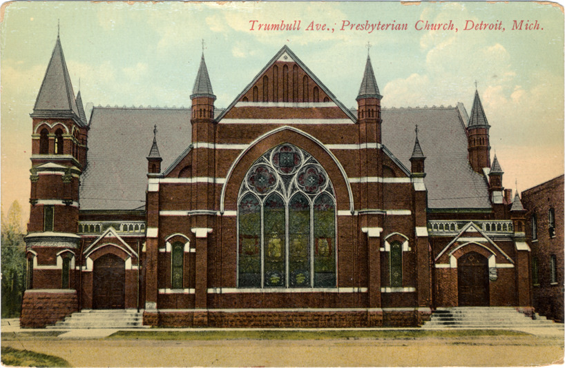 View of Trumbull Ave. Presbyterian Church; brick and stone church building has large stained glass window on facade and two front entrances. Printed on front: "Trumbull Ave., Presbyterian Church, Detroit, Mich." Printed on back: "577, Wolverine News Co., Detroit, Mich. Printed in Belgium." Handwritten on back in upper right corner: "9/18/08."