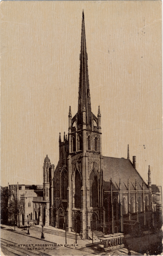 View of Fort Street Presbyterian Church. Gothic-style church building has bell tower; streetcar on tracks adjacent to church. Printed on front: "Fort Street Presbyterian Church, Detroit, Mich." Printed on back: "Norwood Souvenir Co., Cincinnati, O." Handwritten on back: "A Happy New Year to you all." Stamped on back: "Kimball House Museum, 196 Capital Ave. N.E. Battle Creek, Mich." Card is postmarked January, 1910.