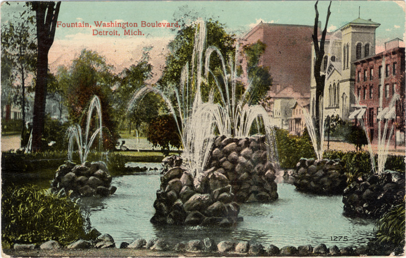 Close-up view of rustic stone fountain in Washington Park; commercial buildings in background. Printed on front: "Fountain, Washington Boulevard, Detroit, Mich., 1275." Printed on back: "The Valentine-Souvenir Co., New York. Printed in U.S.A." Handwritten on back: "Dear Friend, Have you received the pails yet. I have not heard from you. Let me know if you did not and I will go over and see about them. Also let me know how much the butter is. Your friend, Ida." Card is postmarked February 24, 1915.