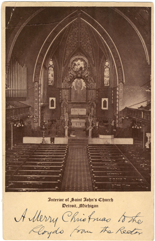 Interior of St. John's Episcopal Church showing altar, stained glass windows, pews and pipe organ. Printed on front: "Interior of Saint John's Church, Detroit, Michigan." Handwritten on front: "A Merry Christmas to the Lloyds from the Rector." Handwritten on back: "1913."