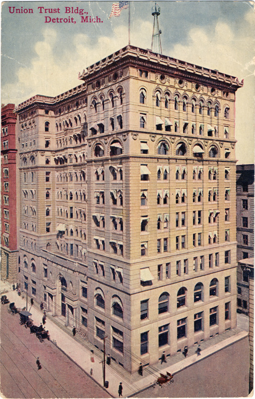 Aerial view of front and side of Union Trust building; multistory building displays American flag on roof. Printed on front: "Union Trust building, Detroit, Mich." Printed on back: "The Union Trust building. Corner of Congress and Griswold Streets is one of the solidest structures in the city, and was finished in 1896 at a cost of $500,000. It is owned by the company whose name it bears. It has two marble stairways and includes 250 suites of offices."