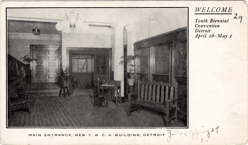 View of foyer of Y.W.C.A. building furnished with armchair, bench, potted plants, writing desk and chair. Printed on front: "Main entrance, new Y.W.C.A. building, Detroit. Welcome, Tenth Biennial Convention, Detroit, April 26-May 1." Handwritten on front: "J.A. Topping, 29." Handwritten on back: "1913?"