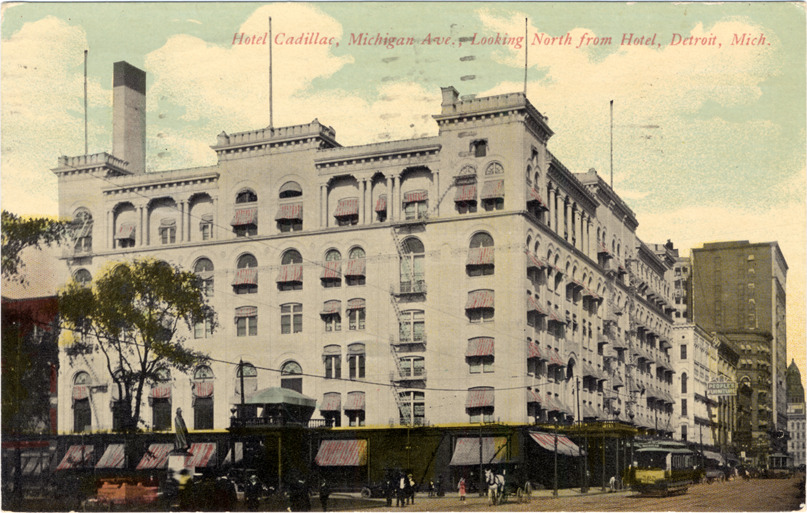Front and side view of Hotel Cadillac; multistory building has striped awnings over windows. Streetcars and horse-drawn wagon in street. Printed on front: "Hotel Cadillac, Michigan Ave., looking north from Hotel, Detroit, Mich." Printed on back: "45, published by the Detroit News Company, Detroit, Mich." Handwritten on back: "Hello Kid, How is everything. I suppose dead as ever. Lively enough here. ... Ed." Card is postmarked August 16, 1914.