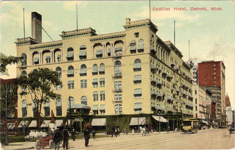 View of Hotel Cadillac; multistory building has striped awnings on windows. "Cadillac" sign over hotel entrance; streetcars and automobile travel in street. Printed on front: "Cadillac Hotel, Detroit, Mich., 1248." Handwritten on back: "Howell, Oct. 28, 1910. Dear May, We are well. We had a little snowstorm last night. I sent you a letter early in the week. I think it was from some of the girls. We have our beans thrashed. Jesse was gone out there today, good by from Mother."