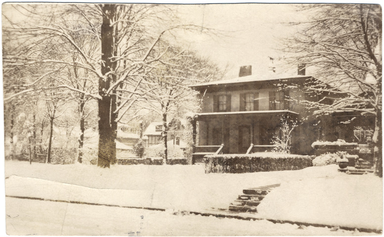 View of two-story Italianate brick house with hipped roof and covered entry porch during winter. Tree branches and ground are covered with snow. Handwritten on back: "Detroit, Mich. 12/25/21. My dear Babe, A familiar sight, no doubt, which sug[g]ests winter. It was like this for Christmas Day. Did you receive 'Little Pierre'? What's your opinion of it? As ever, Edward."