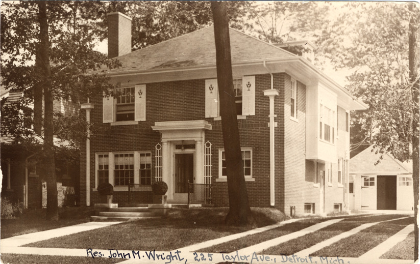 View of two-story brick house with hipped roof; garage at end of driveway. Handwritten on front: "Res. John M. Wright, 225 Taylor Ave., Detroit, Mich." Handwritten on back: "Home John M. Wright, #225 Taylor Ave., Detroit, Michigan." Handwritten on back in upper right corner: "6/30/15." Stamped on back: "W.L. Kenfield photos, N. 5674-J, 416 Ferry Park Ave." 1915 City Directory lists Wm. L. Kenfield, draftsman.