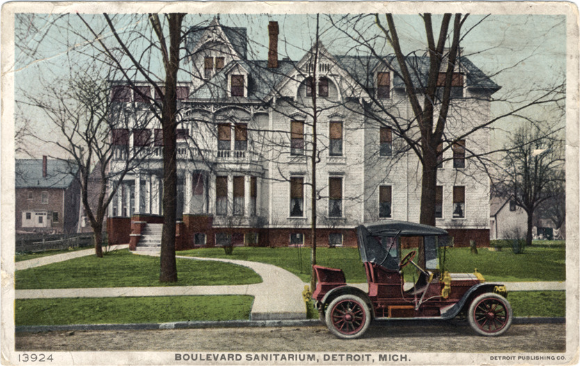 View of Boulevard Sanitarium; three-story wooden-frame Queen Anne style building. Car parked in street. Printed on front: "13924, Boulevard Sanitarium, Detroit, Mich., Detroit Publishing Co." Printed on back: "Phostint card made only by Detroit Publishing Co." Handwritten on back: "251 25th St., about 1913."