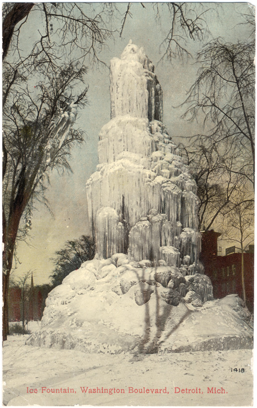 View of ice fountain at Washington Blvd. Printed on front: "Ice fountain, Washington Boulevard, Detroit, Mich." Handwritten on back: "3/4/10. Rec'd your letter today and I will go in and see Mr. Bliss tomorrow a.m. This has been another fine day. Two wks. from tonight I leave for home. Expect to go to the Temple again tonight. With love, Ev." Card is postmarked March 4, 1910.