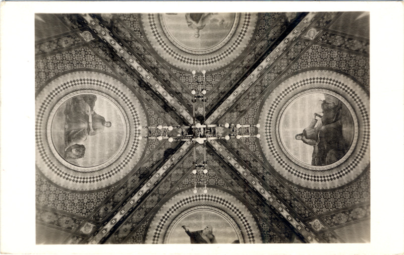 Favorite this☆ Ceiling of First Congregational Church Description: View of circular paintings of the four evangelists on the ceiling of the First Congregational Church. Details Resource ID: bh000689 Subject: Evangelists (Bible) in art Congregational churches--Michigan--Detroit Protestant church buildings--Michigan--Detroit Photographic prints Postcards Date Issued: Unknown year Format: 1 postcard ; 3.5 x 5.5 in. Member of: Burton Historical Collection Filing Location: D/Churches-Cong.-First Rights: Physical rights are retained by DPL. Copyright is retained in accordance with U.S. copyright laws.