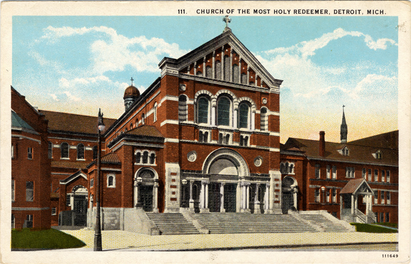 Close-up view of Most Holy Redeemer Church, showing entrance and front steps. Printed on front: "111, Church of the Most Holy Redeemer, Detroit, Mich., 111649." Printed on back: "C.T. Co., Chicago."