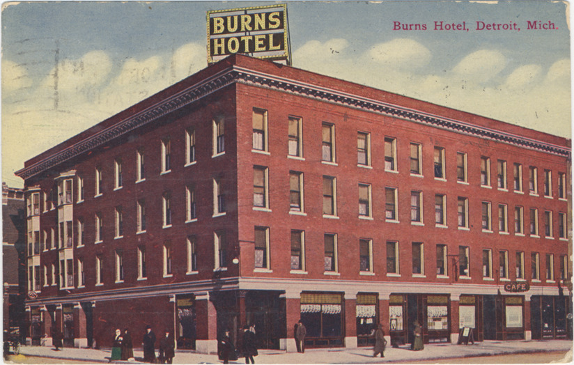 Front and side view of Burns Hotel. Four-story brick building has restaurant on street level and "Burns Hotel" sign on roof. Pedestrians walk on sidewalk. Printed on front: "Burns Hotel, Detroit, Mich." Printed on back: "The Burns Hotel. Corner of Cadillac Square and Bates Street, is one of the new hostleries [sic] of the city. It is owned by Messrs. Burns and Singelyn and has accommodations for 250 guests." Handwritten on back: "Dear Viola, I received your card and was glad to here [sic] from you. The street you are to get off at is Glendale and about what time will you be there. Papa or Robert will meet you. Your friend, Isabell Pearson." Card is postmarked November 26, 1910.