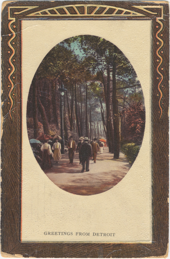 View of men and women walking through tree-lined park. Printed on front: "Greetings from Detroit." Printed on back: "Series no. 2434. Printed in Germany." Handwritten on back: "Dear John, How are you. I am well and hope you are the same. Mary ? [rest undecipherable]." Card is postmarked July 5, 1912.