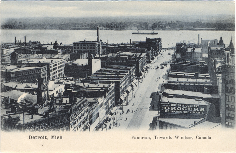 Bird's-eye view of Detroit showing streets and buildings; Detroit River and Windsor, Ontario in distance. Printed on front: "Detroit, Mich., Panoram, towards Windsor, Canada." Printed on back: "No. 1232, Paul C. Koeber & Co., 68 Beaver St., New York (Germany). The PCK series."
