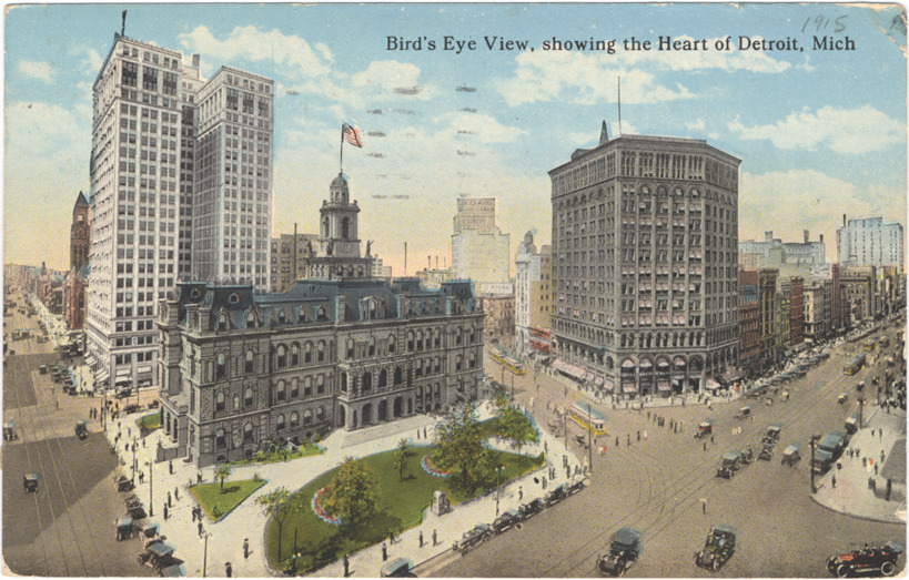 View of City Hall, Dime Bank and Majestic buildings. Automobiles, streetcars and pedestrians in street. Printed on front: "Bird's eye view, showing the heart of Detroit, Mich." Printed on back: "Bird's eye view, showing the heart of Detroit, Mich. The Majestic building at the right is one of Detroit's first skyscrapers. The high building in rear of City Hall is the Dime Bank building recently built. C.T. Co., Chicago, R-71177."