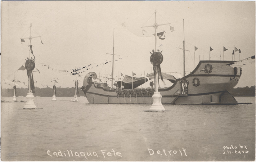 View of ship replica in water court during 1912 Cadillaqua water fete. Ship is surrounded by poles decorated with flags and Native American shields. Printed on front: "Cadillaqua Fete, Detroit. Photo by J.H. Cave." Printed on back: "Pub. by J.H. Cave, photographer ... North, Detroit, Mich."
