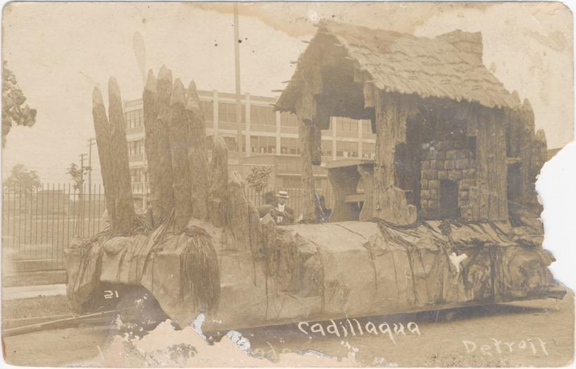 Favorite this☆ Parade float, 1912 Cadillaqua Description: View of float decorated as rustic wooden shelter with table on shore for the 1912 Cadillaqua celebration. Wooden fenceposts in front of float. Commercial building in background. Printed on front: "Cadillaqua, Detroit." Details Resource ID: bh000750 Subject: Parade floats--Michigan--Detroit Parades--Michigan--Detroit Detroit (Mich.)--Anniversaries, etc. Photographic prints Postcards Date Issued: 1912-07 Format: 1 postcard ; 3.5 x 5.5 in. Member of: Burton Historical Collection Filing Location: D/Anniversaries-Cadillaqua Rights: Physical rights are retained by DPL. Copyright is retained in accordance with U.S. copyright laws.