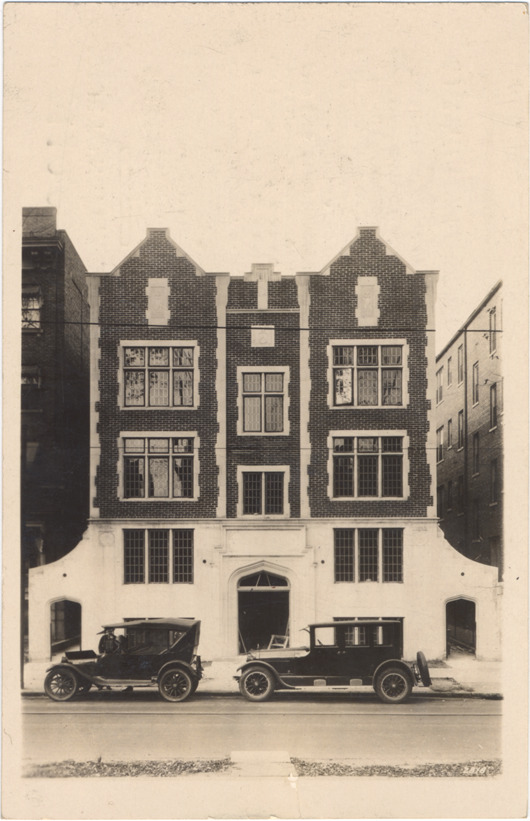 View of Stone Manor apartments; three-story brick and stucco building has two front gables. Two cars parked in front of building. Printed on back: "$110,000.00 issue to net 6 1/2 percent, Stone Manor apartment, location 108 Davenport St. between Woodward & Cass Ave. 45 family brick and steel apt. size of lot 50 feet by 173 feet. First closed mortgage on property owned in fee maturing May 17th 1928, $100, $500, $1000 denominations. Value of mortgaged property $225,000.00 as appraised by C.M. Harmon of the Detroit Real Estate Board and Abraham & Wood architects. This issue offered for sale by the Guaranty Trust Company of Detroit, Guaranty Trust building."