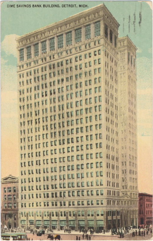 View of Dime Savings Bank building. Pedestrians on sidewalk; automobiles driving on street. Printed on front: "Dime Savings Bank building, Detroit, Mich." Printed on back: "The Dime Savings Bank building, corner of Fort St. West and Griswold St. is being erected on the site formerly occupied by the Walker building. For many years a Baptist church occupied this spot. This will be one of the finest skyscrapers in the country, of ornate design and 22 stories in height. The building is expected to cost $1,500,000.00., No. 268." Handwritten on back: "Recd your card glad to hear from you, how is everything? I like the west so well that I intend to go out further and do not expect to see ... until after 1915. ... #527 Y.M.C.A. Ray V.H." Card is postmarked December 1, 1913.