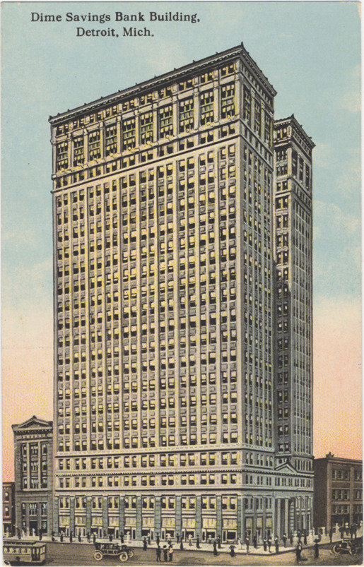 Side view of Dime Savings Bank building. Printed on front: "Dime Savings Bank building, Detroit, Mich." Printed on back: "Dime Savings Bank building, Detroit, Mich. The Dime Savings Bank building is a 23-story office building located on the corner of Griswold and Ford [sic] Streets. It is 286 feet high from the sidewalk to cornice. A beautiful view of the surrounding country is obtained from the roof. C.T. Co., Chicago, R-32212."