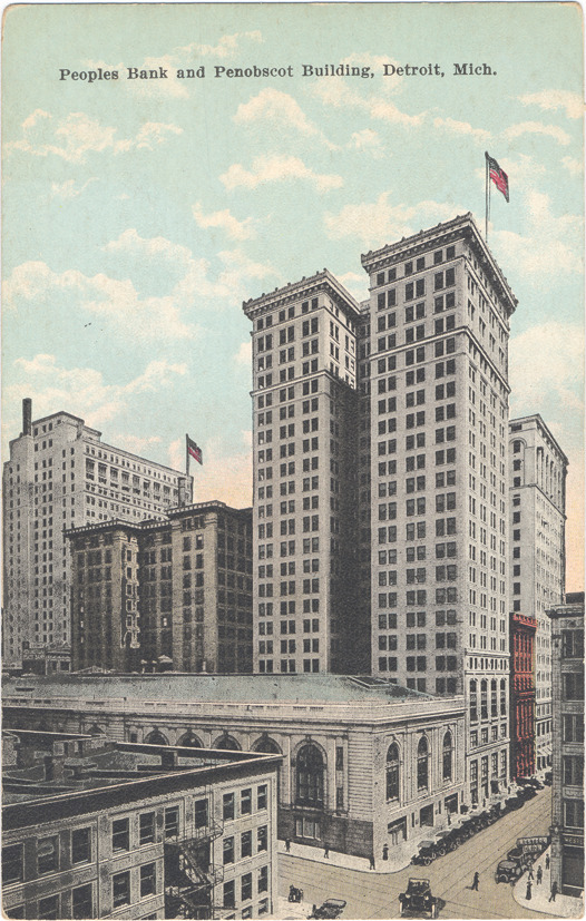 View of Peoples State Bank adjacent to Penobscot building. Commercial buildings in background; automobiles parked in street. Printed on front: "Peoples Bank and Penobscot building, Detroit, Mich." Printed on back: "The People's State Bank, main office, is one of the largest buildings in the middle west used exclusively for banking business. The Penobscot building is the highest and largest office building between New York and Chicago. Pub. by United News Co., Detroit, Mich."