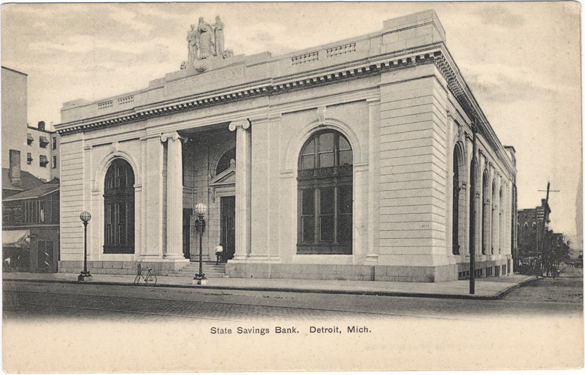 View of State Savings Bank; Neoclassical style building has Ionic columns at entrance and balustrade on roof. Printed on front: "State Savings Bank, Detroit, Mich." Printed on back: "No. 1143, Published by the Detroit News Company, Detroit, Mich. Leipzig-Berlin." American News Co. publisher trademark printed on back.