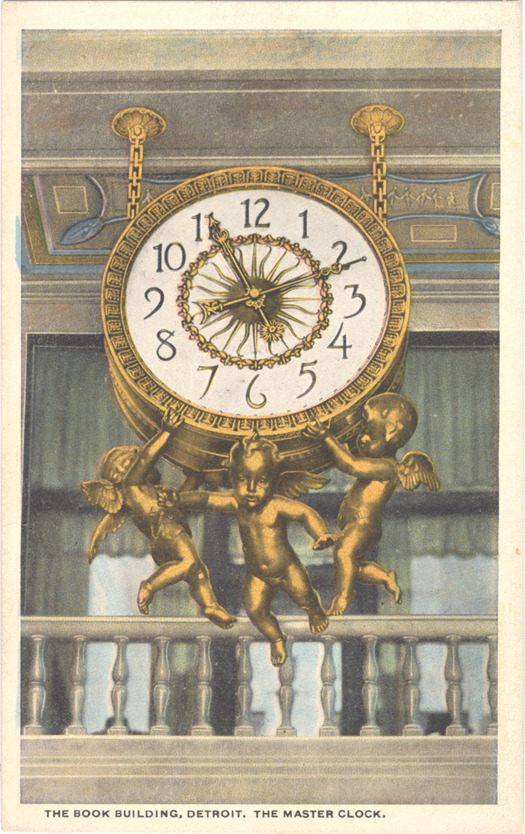 Gold-colored electric clock suspended from Book building ceiling. Three cherubs at bottom, two holding up clock and third in flight. Printed on front: "The Book building, Detroit, the master clock." Printed on back: The Book building, Washington Blvd., Detroit, Mich. The master clock. Every office and shop in the Book building is equipped with an electric clock, all of which are regulated by the master clock. This is a valuable feature as correct time is very important to everyone. The symbolic feature of clock represents flight of time." Printed on back: "C.T. Co., Chicago, R-68936." Handwritten on back in upper right corner: "1/27/28."