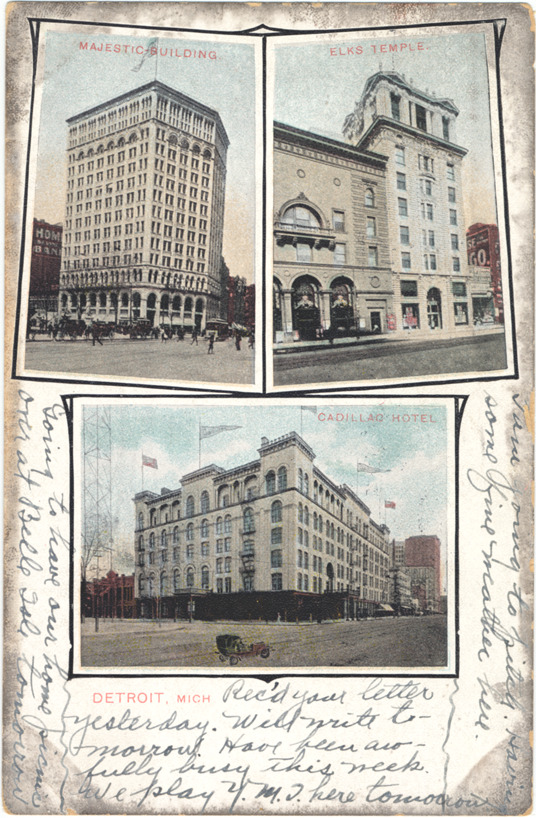 Separate views of Majestic building, Elks Temple and Cadillac Hotel. Printed on front: "Majestic building; Elks Temple, Cadillac Hotel; Detroit, Mich." Handwritten on front: "Rec'd your letter yesterday. Will write tomorrow. Have been awfully busy this week. We play Y.M.C. here tomorrow. I am going to pitch. Having some fine weather here. Going to have our home picnic over at Belle Isle tomorrow." Printed on back: "Published by German-American Postal Card Co., Cleveland, Ohio and Leipzig." Card is postmarked May 27, 1910.