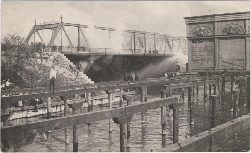 View of seated and standing men on wooden supports watching Belle Isle Bridge fire. Smoke rises from truss bridge; some pedestrians stand near entrance to bridge. Printed on back: "Belle Isle Bridge fire, April 27, 1915. W.D. Benham Co., Detroit, Mich."