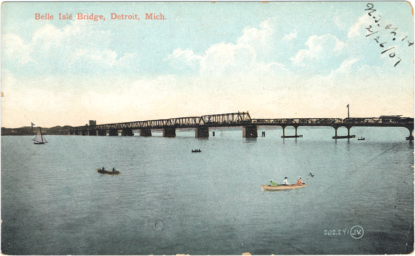 View of Belle Isle Bridge; truss bridge spans Detroit River. Boats in foreground. Printed on front: "Belle Isle Bridge, Detroit, Mich., 202,241." Handwritten on front: "N.J.W. 79, 2/26/07." Printed on back: "Published by Wolverine News Co., Detroit, Mich. Printed in Great Britain."