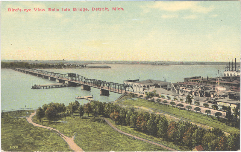 Aerial view of Belle Isle Bridge; truss bridge spans Detroit River. Buildings, factories and park in foreground. Printed on front: "Bird's-eye view, Belle Isle Bridge, Detroit, Mich." Printed on back: "1281, Belle Isle Bridge, connecting the main land with Belle Isle, Detroit's largest pleasure spot, is half a mile in length and spans the Detroit River at a height of 30 feet. It forms the connecting link over which thousands of pleasure seekers on foot, in carriages and automobiles pass on every pleasant day." Handwritten on back: "7/15/12."