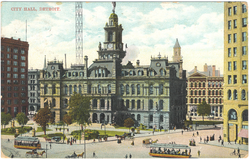 View of Detroit City Hall; pedestrians, streetcars and horse-drawn vehicles in foreground. Printed on front: "City Hall, Detroit." Handwritten on back: "Hello John, I am having a swell time. How are you making out with the new buggy." Postmark undecipherable.