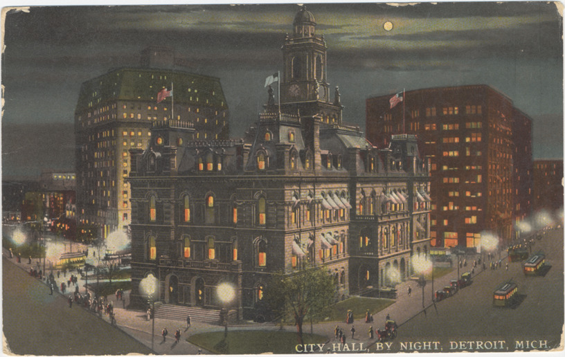 Side view of Detroit City Hall at night with Pontchartrain Hotel in background. Streetlights and building windows illuminated; moon overhead. Printed on front: "City Hall, by night, Detroit, Mich." Printed on back: "City Hall, Detroit, Mich. City Hall cost $600,000. The clock is one of the largest in the United States and there is but one larger in the world. The dials are 8 1/2 feet in diameter. C.T. Co., Chicago, A-17429." Handwritten on back: "Sunday. Dear Mother, Just a line to let you know that Fred's boat is safe ... call up the Port O. and they told that they were safe at Duluth. Were laying at the ... during the storm. By by, Mary." Card is postmarked November 17, 1913.