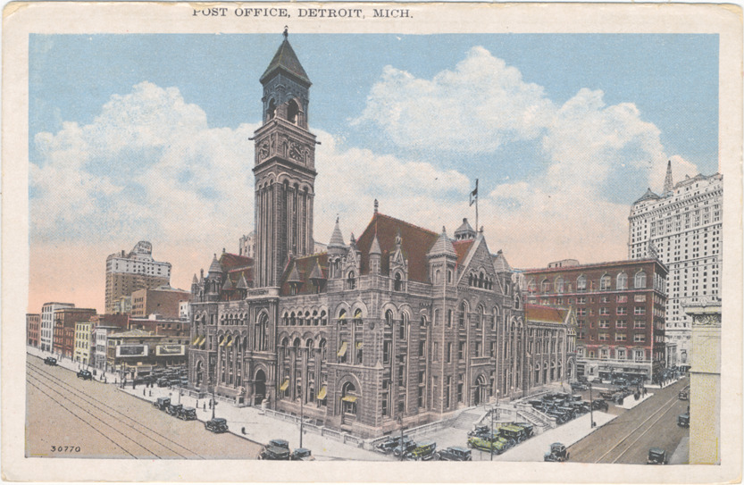 Favorite this☆ U.S. Post Office Description: View at an angle of U.S. Post Office; Richardsonian Romanesque building has clock tower. Automobiles parked next to building. Printed on front: "Post Office, Detroit, Mich., 30770." Printed on back: "Pub. by United News Co., Detroit, Mich." Details Resource ID: bh000842 Subject: Post office buildings--Michigan--Detroit Romanesque revival (Architecture)--Michigan--Detroit Postcards Publisher: United News Company Date Issued: Unknown year Format: 1 postcard : col. ; 3.5 x 5.5 in. Member of: Burton Historical Collection Filing Location: D/Buildings-Federal-Post Office, 1897 Rights: Physical rights are retained by DPL. Copyright is retained in accordance with U.S. copyright laws.