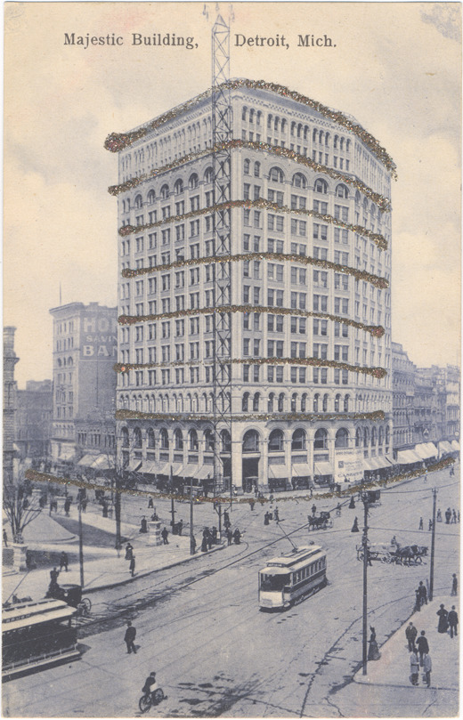 Front and side view of Majestic building with pedestrians, streetcars and horse-drawn vehicles in foreground. Printed on front: "Majestic building, Detroit, Mich." Glitter glued to postcard outlines sidewalk and building. Printed on back: "Kresge & Wilson, Detroit, Mich. Printed in Germany." Handwritten on back: "Dear Aunt, I received your letter & was glad hear from you again. I had to stay home today & do the work because ... leg isn't any better. My birthday is May 23, I am going to be nineteen years old. We are having grand weather here. Hoping you are all well happy. When is your birthday. Your loving niece, Irma."