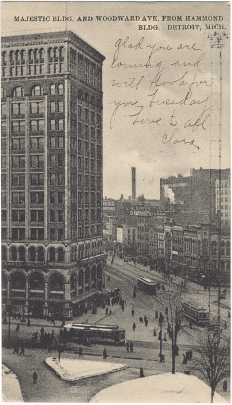 View of Majestic building and commercial buildings along Woodward Ave. Streetcars and pedestrians in foreground. Printed on front: "Majestic building and Woodward Ave. from Hammond bldg., Detroit, Mich." Handwritten on front: "Glad you are coming and will look for you Tuesday. Love to all, Clara." Card is postmarked September 16, 1906.