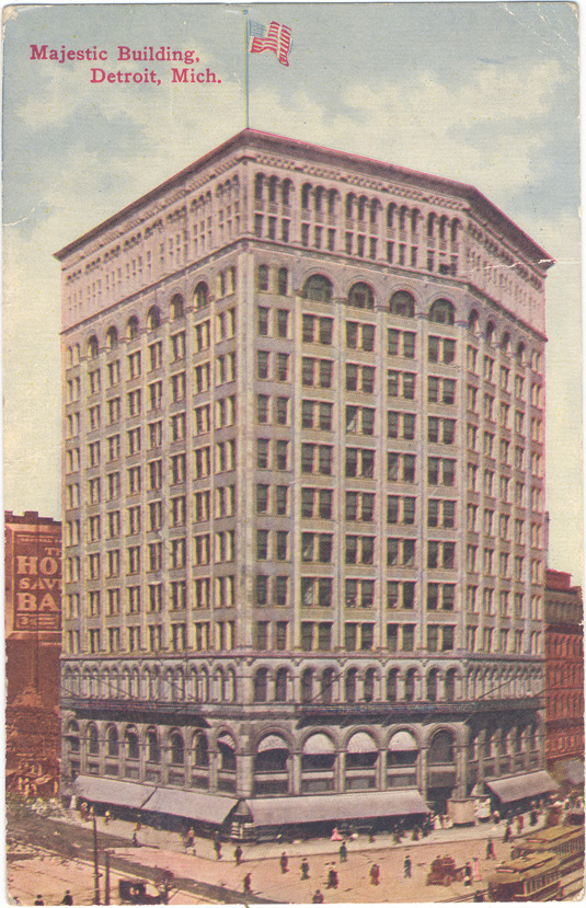 Front and side view of Majestic building. Printed on front: "The Majestic building, Detroit, Mich." Printed on back: "The Majestic building, corner of Woodward and Michigan Avenues, was one of the first tall office buildings to be erected in the city and is fourteen stories in height. From its roof one may obtain a magnificent bird's-eye view of the surrounding city." Handwritten on back: "I will come home Monday and I recived [sic] the money safe. Ned." Card is postmarked August 18, 1910.