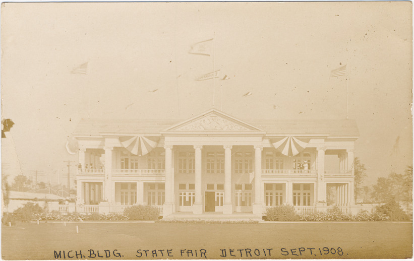 Favorite this☆ Michigan building at the Michigan State Fair Description: View of Michigan building at the Michigan State Fair. Two-story Neoclassical style building has Ionic columns and triangular pediment. Bunting displayed on facade. Printed on front: "Mich. bldg., State Fair, Detroit, Sept. 1908." Details Resource ID: bh000892 Subject: Michigan State Fair--Buildings Neoclassicism (Architecture)--Michigan--Detroit Photographic prints Postcards Date Issued: 1908-09 Format: 1 postcard : 3.5 x 5.5 in. Member of: Burton Historical Collection Filing Location: D/Buildings-Mi. building-State Fair Rights: Physical rights are retained by DPL. Copyright is retained in accordance with U.S. copyright laws.